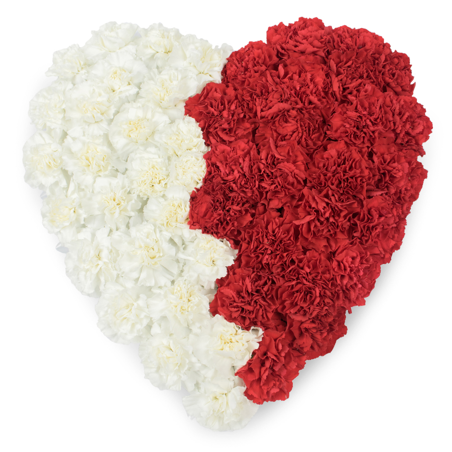 Our delightful heart-shaped bouquet combines white and red carnations in a unique design, perfect for expressing heartfelt emotions. Each flower is hand-picked to guarantee freshness.